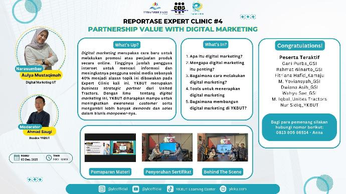 Expert Clinic yang diadakan oleh YLC pada tanggal 6 Desember 2023 merupakan Expert Clinic yang ke-4 di tahun 2023. Expert Clinic kali ini mengusung tema yang menarik, yaitu “Partnership Value With Digital Marketing”. Selain menarik, tema ini merupakan topik yang sangat penting untuk dibahas saat ini mengingat tingginya penggunaan internet dalam mencari informasi. Tujuan diadakannya Expert Clinic dengan tema ini adalah untuk mengedukasi para audiens mengenai bagaimana cara memanfaatkan platform dan sosial media yang baik dan benar dalam memasarkan suatu produk.