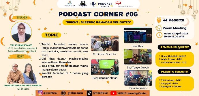 Rangkaian Podcast Corner kali ini berkolaborasi dengan DPP, yaitu Ibu Tri Kurniawati yang membahas tema besar mengenai keseruan selama Ramadan. Inovasi konsep Podcast Corner kali ini kami sajikan berbeda dengan sebelumnya dengan menggunakan bilingual language yang menggabungkan bahasa Inggris dan Bahasa Indonesia.