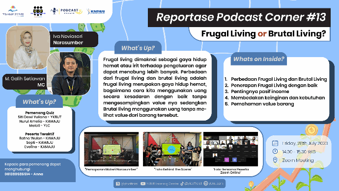 Pada Hari Jumat (28/07/2023), YLC berkolaborasi dengan Kamaju dalam acara Podcast Corner #13 dengan tema menarik untuk dibahas yaitu "Frugal Living or Brutal Living?" yang disampaikan oleh narasumber dari Kamaju yaitu Mbak Iva Noviasari dengan dipandu oleh host kami yaitu M. Galih Setiawan dengan pembawaan acara yang menarik dan relate dengan kehidupan kantor.
