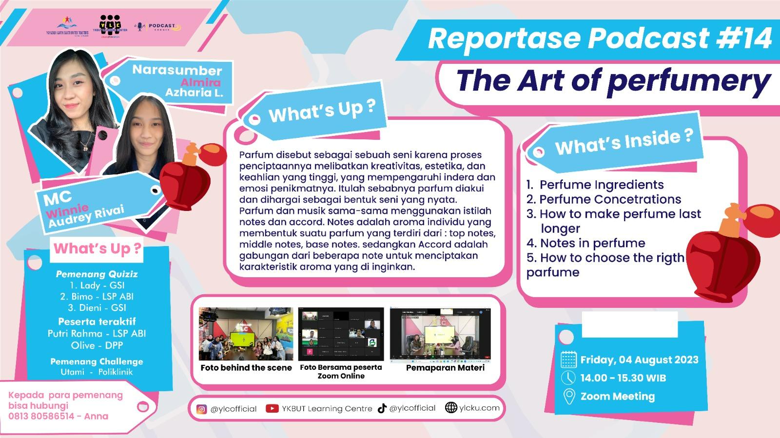 Inilah keseruan yang dapat diambil dari Podcast Corner #14. Acara ini disambut baik dan direspons dengan antusias oleh para peserta melalui kolom chat zoom dengan banyak nya pertanyaan yang diajukan, serta peserta yang mengikuti kuis untuk bersaing memperoleh poin tertinggi guna memenangkan hadiah menarik dari tim YLC. Selain itu, terdapat tambahan menarik pada Podcast Corner #14, yaitu dengan hadirnya Challenge yang diberikan oleh narasumber, dimana peserta di tantang untuk memposting parfum favorit nya dan di posting ke social media. Bagi peserta yang beruntung akan mendapatkan hadiah menarik dari YLC serta hadiah parfum dari Almira Azharia selaku narasumber.