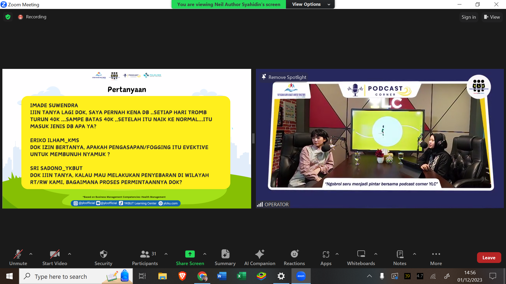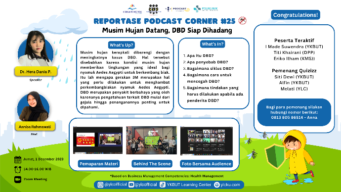 Podcast Corner yang diadakan oleh YLC pada tanggal 1 Desember 2023 merupakan Podcast Corner yang ke-25. Podcast corner kali ini mengusung tema yang menarik, yaitu “Musim Hujan Datang, DBD Siap Dihadang”. Selain menarik, tema ini merupakan topik yang sangat krusial mengingat saat ini sudah memasuki musim hujan yang kerapkali dibarengi dengan meningkatnya kasus DBD. Tujuan diadakannya podcast corner dengan tema ini adalah untuk mengedukasi para audiens mengenai DBD mulai dari penyebab hingga cara mengatasinya.