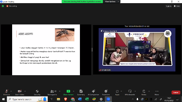 DBD merupakan topik yang sangat penting untuk dibahas mengingat saat ini sudah memasuki musim hujan dan biasanya musim hujan dibarengi dengan meningkatkan kasus DBD. Hal ini disebabkan karena musim hujan memberikan lingkungan yang ideal bagi nyamuk Aedes Aegypti untuk berkembang biak. Banyaknya genangan air, tempat-tempat yang lembab, serta lingkungan yang kotor merupakan area yang cocok bagi nyamuk Aedes Aegypti untuk berkembang biak. Selain itu, narasumber yang ahli di bidangnya membuat materi yang dibawakan semakin menarik. Pembawaan host yang santai dan asyik juga membuat suasana podcast menjadi lebih hidup sehingga meningkatkan antusiasme audiens untuk mengikuti keberjalanan podcast hingga akhir.