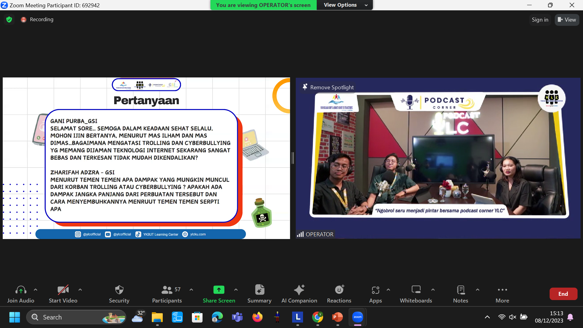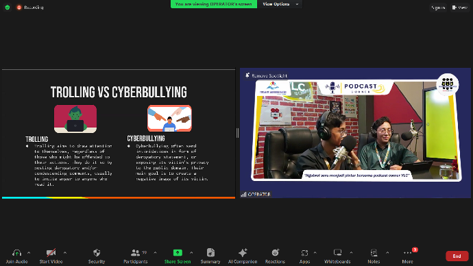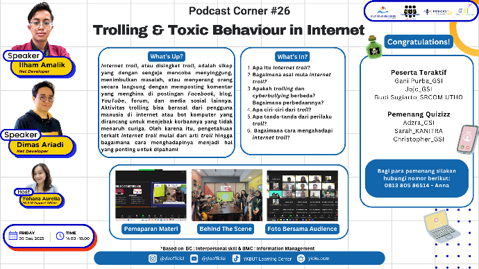 Podcast Corner #26 disampaikan oleh narasumber dari GSI, Ilham Amalik dan Dimas Ariadi serta host Yohana Aurelia. Audience sangat antusias dalam menyimak pembahasan kali ini. Tanpa disadari sosialisasi mengenai internet troll sangat penting.