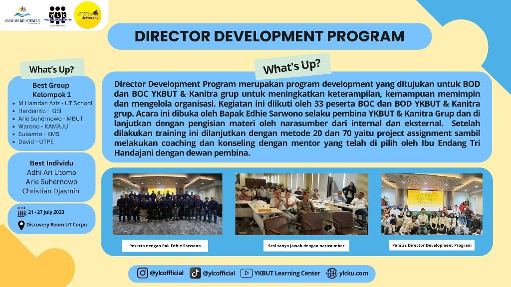 Pada tanggal 21 - 27 juli 2023 lalu YLC berkolaborasi dengan UT Corpu melaksanakan Director Development Program. Director Development Program merupakan program development yang ditujukan untuk BOD dan BOC YKBUT & Kanitra grup. Dalam program ini mengangkat 4 pilar manteri development yaitu People Management, Process Management, Strategic Management dan Finance Management.