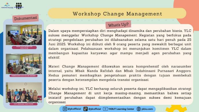 Dalam upaya mempersiapkan diri menghadapi dinamika dan perubahan bisnis, YLC sukses menggelar Workshop Change Management. Kegiatan yang berfokus pada strategi pengelolaan perubahan ini dilaksanakan selama satu hari penuh pada 25 Juni 2025. Workshop ini diikuti oleh 9 orang peserta yang mewakili berbagai unit dalam organisasi. Pelaksanaan workshop ini menunjukan komitmen YLC dalam membangun kapasitas karyawan agar mampu menjadi agen perubahan yang efektif.