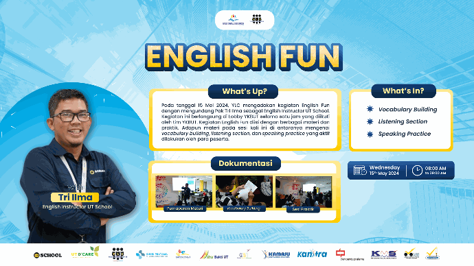 Rabu, 15 Mei 2024 - YLC menyelenggarakan kegiatan English Fun dengan mengundang Bapak Tri Ilma, English Instructor dari UT School. Kegiatan ini berlangsung di Lobby YKBUT selama satu jam dan diikuti oleh tim YKBUT. Sesi ini mencakup berbagai materi dan praktik, termasuk vocabulary building, listening section, dan speaking practice.