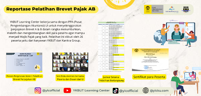 YKBUT Learning Center bekerja sama dengan PPA (Pusat Pengembangan Akuntansi) UI untuk menyelenggarakan perpajakan Brevet A & B dalam rangka menumbuhkan, melatih dan mengembangkan skill para peserta agar mampu menjadi Wajib Pajak yang baik. Pelatihan ini diikuti oleh 26 peserta yaitu dari karyawan YKBUT dan Kanitra Group. Pelatihan Brevet dilaksanakan selama 1 bulan mulai dari tanggal 04 Oktober 2022 hingga 16 November 2022. Dengan adanya program pelatihan ini, diharapkan peserta menguasai teori, konsep, dan administrasi perpajakan di Indonesia serta memahamai bagaimana cara mengisi eSPT yang baik dan benar.