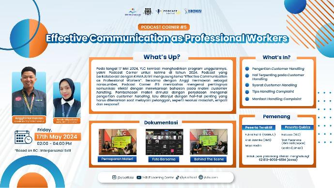 Jumat, 17 Mei 2024 - YLC kembali menghadirkan program unggulannya, yakni Podcast Corner untuk kelima kalinya di tahun 2024 ini. Diadakan secara hybrid, podcast kali ini berkolaborasi dengan KAMAJU untuk mengusung tema Effective Communication as Professional Workers. Acara dimulai pukul 14.00 dan dihadiri oleh lebih dari 35 peserta yang hadir dengan semangat melalui platform Zoom.