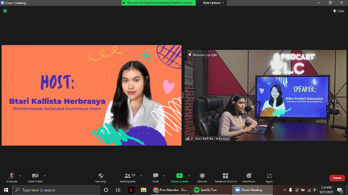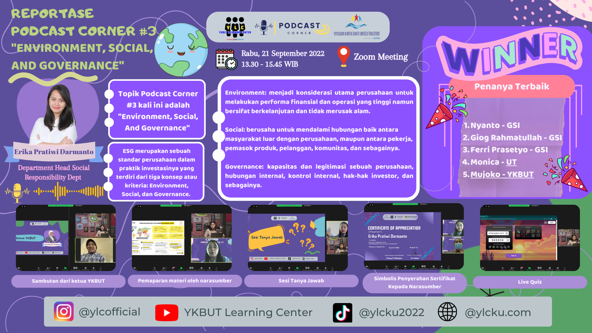 Podcast Corner #3 YLC merupakan salah satu program Knowledge Management yang menghadirkan SME (Subject Material Expert) dengan berbagai macam disiplin ilmu. Acara kali ini dilaksanakan pada hari Rabu, 21 September 2022, pada pukul 13.30 - 15.45 WIB . Pada podcast Corner kali ini topik yang di usung adalah " Environment, Social, And Governance" dengan narasumber ibu Erika Pratiwi Darmanto selaku Head Social Responsibility Dept.